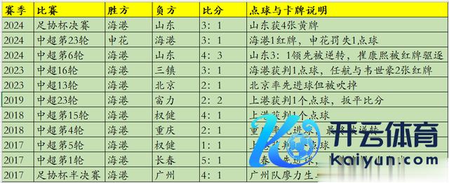 1、2017-2024的八年间,马宁司法海港比赛11次,包括广州、山东、北京、三镇等前中超冠军在内的海港敌手,忖度打算获利1胜2平8负,被吹掉进球1个,被扳平1次,被逆转4次,被出示红牌5张,海港共得到点球5个。