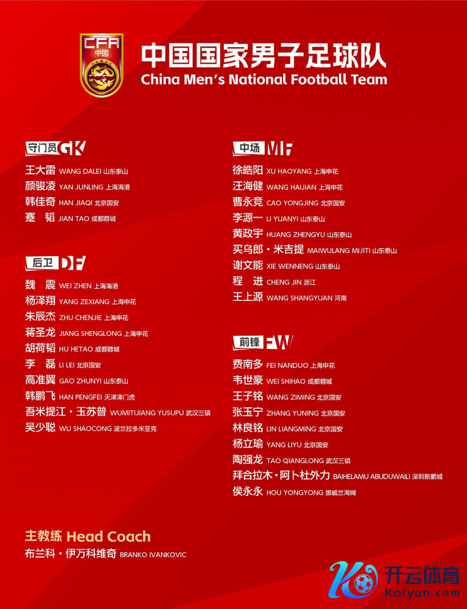 附:国足32东说念主集训名单门将:王大雷、颜骏凌、韩佳奇、蹇韬后卫:魏震、杨泽翔、朱辰杰、蒋圣龙、胡荷韬、李磊、高准翼、韩鹏飞、吾米提江、中场:徐皓阳、汪海健、曹永竞、李源一、黄政宇、买乌郎、谢文能、程进、王上源前卫:费南多、韦世豪、王子铭、张玉宁、林良铭、、陶强龙、拜合拉木、侯永永