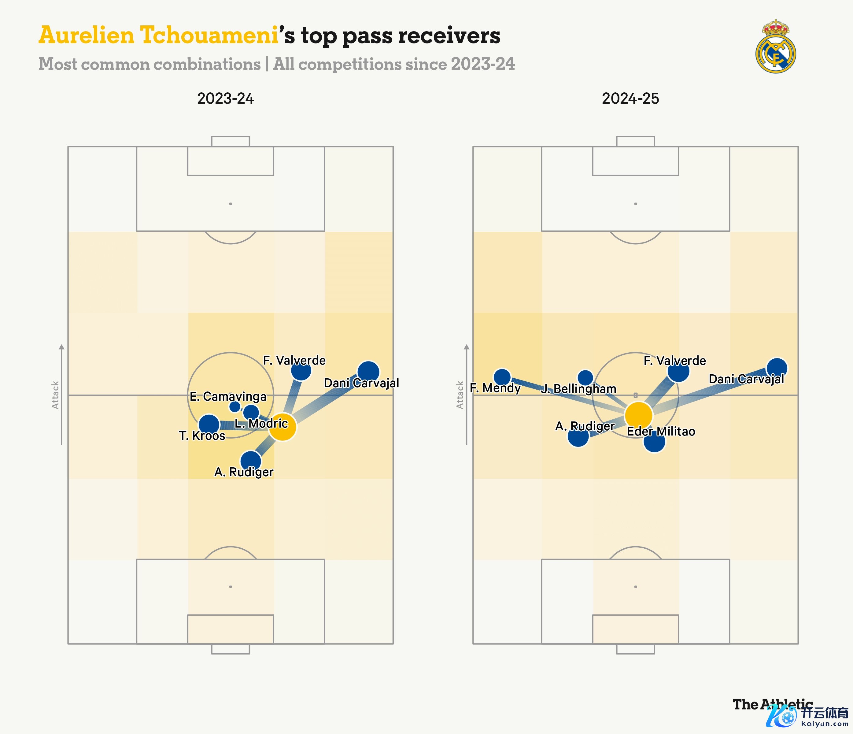 克罗斯今夏的已而退役让琼阿梅尼不得不立即在皇马演出更有影响力的变装,在本赛季西甲出场技巧擢升500分钟的球员中,琼阿梅尼是传球准确率(92.8%)最高的中场球员,他的场均长传(30码以上的传球)次数从5.1次加多到6.9次,而这恰是克罗斯所擅长的。