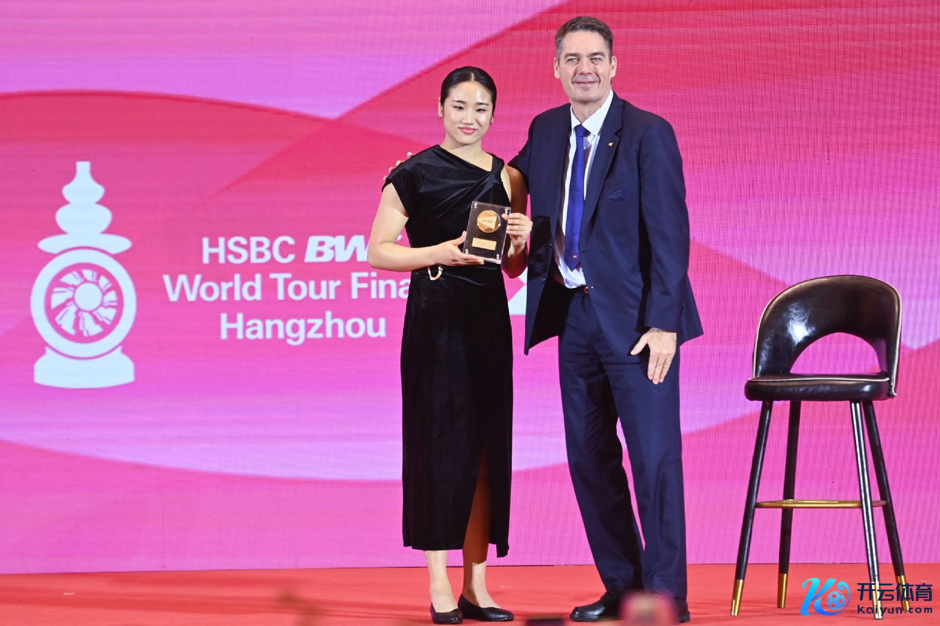 宇宙羽联主席拉尔森为获取年度最好女子单打畅通员的韩国选手安洗莹(左)受奖。