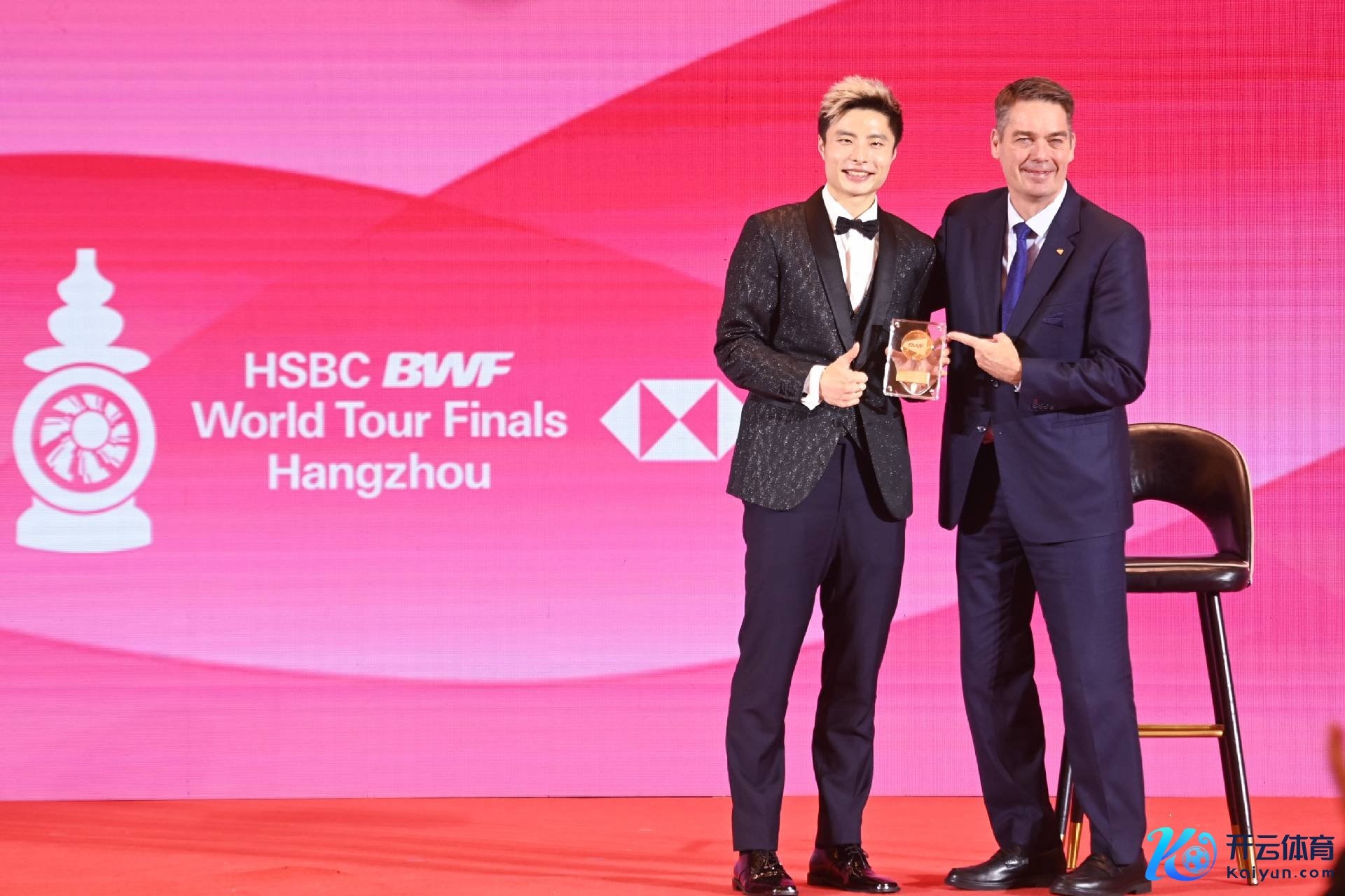 宇宙羽联主席拉尔森为为获取年度最好须眉单打畅通员的中国选手石宇奇(左)受奖。