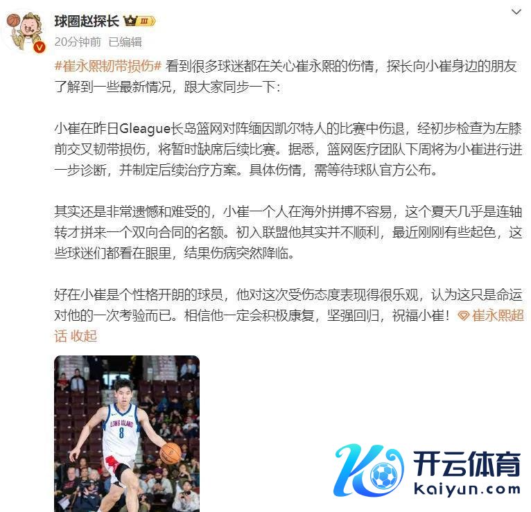 最自后说说崔永熙的伤情。听说是国内的体育记者裸露的音问,他的左膝前交叉韧带受伤了。这意味着他敬佩要休息很长一段技术。不外也算是苦难中的万幸,还好没全齐扯破,否则可能通盘这个词赛季齐要报销了。