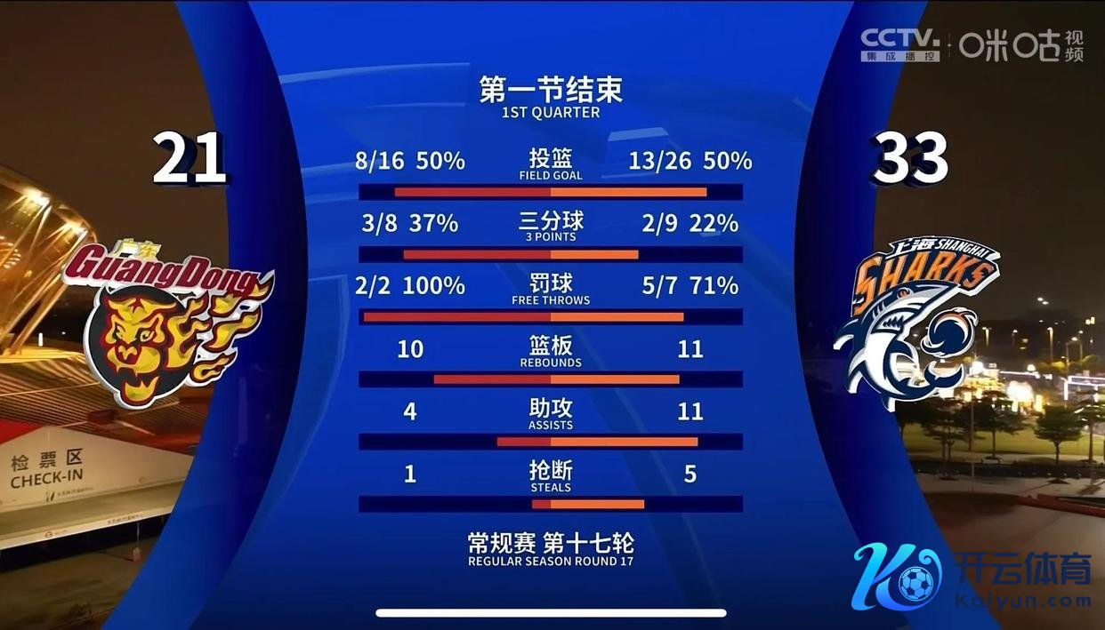 广东队抢不到篮板球,王人被上海队捡到了。洛夫顿还打成了2+1,张皓嘉也如故4次犯规了。第一节比赛适度,广东队以21比33过期于上海队。